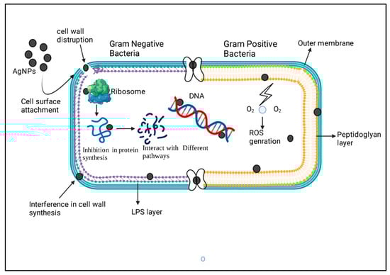 The antimicrobial efficiency of AgNPs is more against Gram-negative than Gram-positive bacteria []. Gram-negative bacteria have a thick LPS layer in their cell wall with a thin peptidoglycan layer. In contrast, Gram-positive bacterial cell walls contain thin LPS and thick peptidoglycan layers. The cellular wall made of a thick peptidoglycan layer reduces the chances of AgNP penetration into cells []. The uptake of AgNPs is significant for the antibacterial effect, as it has been demonstrated on various Gram-positive and Gram-negative bacteria []. In Figure 3 and Table 2, we explain the comparative mode of action of AgNPs on both Gram-positive and Gram-negative organisms. It is acknowledged that AgNPs smaller than 10 nm can alter cell permeability by entering into bacterial cells and causing cell damage.