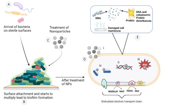 Diagrammatic representation of the activity of AgNPs on biofilm. (A) Bacterial cells approach biological or non-biological surfaces. (B) They adhere on the surface firmly and start multiplying, and the whole mass contains water, nuclei acid, polysaccharides, proteins, lipids, and ions (extracellular polymeric structures). (C) Treatment of NPs. (D) The NPs attack different vital functional sites of bacteria. (E) Shown inside of bacteria-like structure (i) Altered bacterial membrane shows electrostatic interaction. (ii) Damages the DNA and DNA replication with hydrophobic interaction. (iii) ROS generation by weak π-π interaction. (iv) Block the protein synthesis process through hydrogen bonding interaction. And causes disturbances in the electron transport chain by ionic interaction and van der Waal interaction.