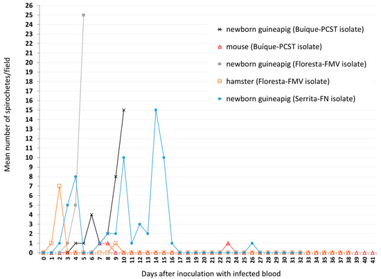 Guinea pigs 2, 4, and 6 were bled at the 18th day after tick infestation (when the mean numbers of spirochetes/field were 4, 5, and 7, respectively), and their blood samples were inoculated into other animals to perform the first experimental animal passage of the spirochetes. In this case, the blood of guinea pig 2 (isolate Buíque-PCST) was inoculated into a newborn guinea pig and a mouse (Table 2). Blood samples of this newborn guinea pig showed motile spirochetes (mean: ≤1 to 15 spirochetes/field) from the 4th to the 10th day after inoculation (Figure 4), when it was euthanized by exsanguination and its plasma cryopreserved. Dark-field microscopy of the inoculated mouse revealed spirochetes only at the 7th, 8th, and 23th days after inoculation (mean ≤1 spirochete/field), despite of this experimental animal being daily examined until the 41st day (Figure 4). The blood of guinea pig 4 (isolate Floresta-FMV) was inoculated into a newborn guinea pig and a hamster (Table 2). Blood samples of this newborn guinea pig showed motile spirochetes (mean: ≤1 to 25 spirochetes/field) from the 3rd to the 5th day after inoculation (Figure 4), when it was euthanized by exsanguination and its plasma cryopreserved. Dark-field microscopy of the inoculated hamster revealed spirochetes only at the 1st, 2nd, and 9th days after inoculation (mean ≤1 or 7 spirochetes/field), despite of this experimental animal being daily examined until the 38th day (Figure 4). Finally, the blood of guinea pig 6 (isolate Serrita-FN) was inoculated into a newborn guinea pig, which showed motile spirochetes in blood at 2 to 4, 7 to 16, and 26 days after inoculation, with mean numbers of spirochetes/field varying from ≤1 to 15 (Figure 4). No experimental animal developed fever or clinical abnormalities during the present study.