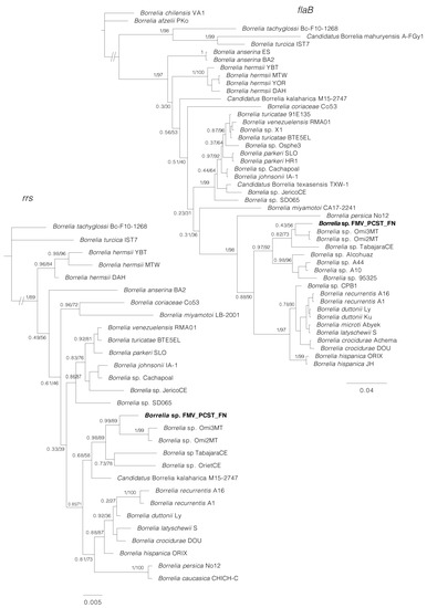 28. Ras, N.M.; Lascola, B.; Postic, D.; Cutler, S.J.; Rodhain, F.; Baranton, G.; Raoult, D. Phylogenesis of relapsing fever Borrelia spp. Int. J. Syst. Bacteriol. 1996, 46, 859–865. [Google Scholar] [CrossRef]