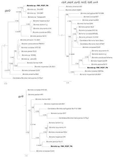 5. Margos, G.; Gofton, A.; Wibberg, D.; Dangel, A.; Marosevic, D.; Loh, S.-M.; Oskam, C.; Fingerle, V. The genus Borrelia reloaded. PLoS ONE 2018, 13, e0208432. [Google Scholar] [CrossRef] [PubMed]