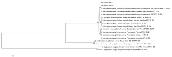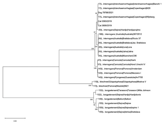 - La Scola, B.; Bui, L.T.; Baranton, G.; Khamis, A.; Raoult, D. Partial rpoB gene sequencing for identifcation of Leptospira Species. FEMS Microbiol. Lett. 2006, 263, 142–147. [Google Scholar] [CrossRef]
