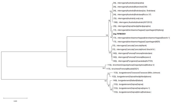 - Balboni, A.; Zamagni, S.; Bertasio, C.; Boniotti, M.B.; Troìa, R.; Battilani, M.; Dondi, F. Identification of Serogroups Australis and Icterohaemorrhagiae in Two Dogs with a Severe Form of Acute Leptospirosis in Italy. Pathogens 2020, 9, 351. [Google Scholar] [CrossRef]