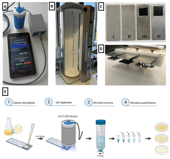 (A) Collimated-beam UV-C LED device with measurement and control units. (B) UV-C LED device for the irradiation of endoscopes with a cylindrical irradiation chamber. (C) Test carrier with test areas made of different materials. (I) Sandblasted aluminum smooth, (II) sandblasted aluminum textured, (III) elastomer and (IV) hard plastic. (D) Set-up for testing the influence of shading on UV-C efficiency. (E) Schematic diagram of the experimental setup and the different steps of the test procedure. Created with Biorender.com.