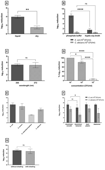 Log10 reduction of microorganisms under different conditions. (A) Comparison of the inactivation effects of UV-C treatment of suspension and surface-dried E. coli inoculated with 109 CFU/mL after irradiation with 15,000 J/m2 at 272 nm in TSB. (B) Reduction of E. coli and C. albicans suspended in two different solutions as well as air-dried and exposed to 15,000 J/m2 at 272 nm. (C) Log10 inactivation of E. coli air-dried on a smooth aluminum surface and exposed to 200 J/m2 at different wavelengths. (D) Percent log10 reduction of different concentrations of C. albicans that were air-dried and treated with 15,000 J/m2 at 272 nm. (E) Inactivation performance for E. coli, S. aureus (1 × 109 CFU/mL), C. albicans and G. stearothermophilus (1 × 108 CFU/mL) resuspended in phosphate buffer and irradiated with 15,000 J/m2 using UV-C LED at 272 nm. (F) Comparison of the reduction of E. coli (109 CFU/mL) and C. albicans (108 CFU/mL) on different surface materials after treatment with UV-C at a dose of 15,000 J/m2. (G) Inactivation effects of UV-C treatment of E. coli (109 CFU/mL) with and without shading after irradiation with 15,000 J/m2 at 272 nm. Data are presented as the mean ± standard deviation of three independent experiments performed in duplicate; p ≤ 0.0001 (****), p ≤ 0.01 (**), p ≤ 0.05 (*), p > 0.05 (ns).