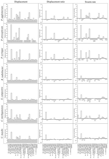 Myxobacteria displacement, displacement ratio and swarm rate on seven phytopathogenic prey organisms. Displacement (left) is the diameter (mm) of the advancing swarm edge on day eight on a lawn of prey. Displacement ratio (middle) is calculated using Equation (1) and compensates for differences in strain-specific intrinsic swarm expansion with/without nutrients. Swarm rate (right) is measured as the rate (mm/day) of displacement on a lawn of prey minus the rate of displacement on non-nutrient TPM agar. Myxobacteria are ordered according to ANI similarity. From left to right, strains are: CA027, CA018, AB024B, CA023, AB022, CA010, CA006, DSM 2260, AB056, DSM 16526, CA005, DK1622, DSM 14697, CA053A, CA060A, CA032A, DSM 14698, AB055B, AB053B, CA051A, DSM 16525, DSM 14675, DSM 2259, DSM 14696, AB047A, AB047B, So ce56, AB050C.