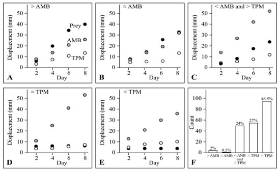 where Displacementprey is the mean displacement (mm) on prey lawn, DisplacementTPM is the mean displacement on TPM medium and DisplacementAMB is the mean displacement on AMB medium. The ‘prey-specific swarm rate’ Equation (2), divides the mean corrected displacement by the number of elapsed days.