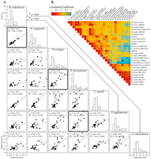Pairwise comparisons of myxobacteria predation. (A) linear regressions and correlations between displacement ratios for pairs of prey organisms, and histograms of displacement ratios for each prey. Lines between histograms have a significantly different mean (ANOVA F(6, 180) = 2.624, p = 0.018). Bold boxed scatter plots indicate a significant linear regression (R2 > 0.75 and p < 0.001). (B) correlations in displacement ratios between myxobacteria strains, where warm and cool colours indicate high and low correlation coefficients, respectively. Boxes with asterisks indicate significant correlations (p < 0.05), all of which were positive except for CA006/CA060A.
