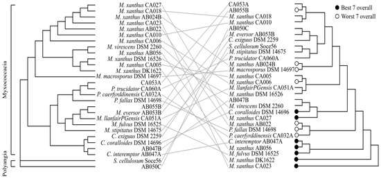 ANI distance tree and predation performance tanglegram. ANI similarity (Left) does not reflect predation performance (Right). ANI distancing clustered myxobacteria into two classes, Myxococcacia and Polyangia, and separated the Myxococcacia by genera. Hierarchical clustering of predation performance: black and white points indicate the ‘best’ and ‘worst’ seven overall predators, respectively.
