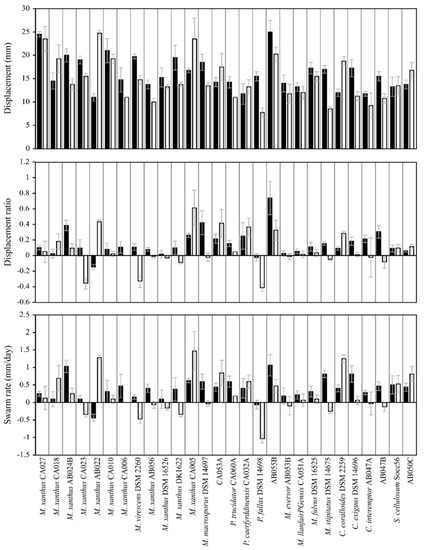 Displacement (top), displacement ratio (middle) and swarm rate (bottom) of myxobacteria strains on Pectobacterium atrosepticum. Black and white bars reflect dead and lysed prey cells, respectively. Error bars represent standard deviation, where n = 4 for each myxobacterium.