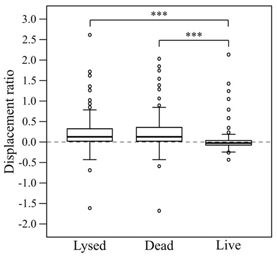 Comparison of myxobacterial displacement ratios obtained on lysed, dead and live prey cells. Asterisks (***) signify highly significant differences (p < 0.001, n = 28).