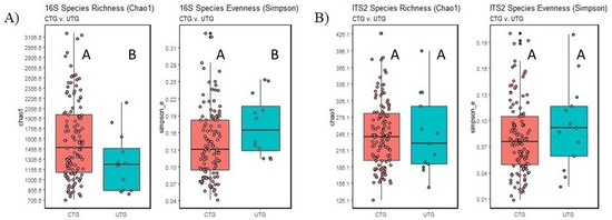 Alpha diversity metrics for CTG and UTG. (A): Bacterial community. (B): Fungal community. For each metric, columns marked by differing letters are significantly different (Wilcoxon test, BH-adjusted p < 0.05).