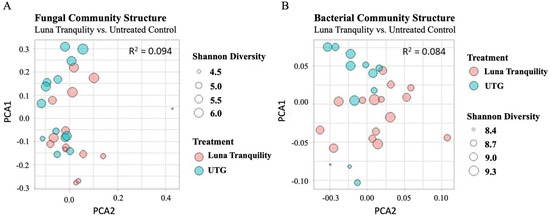 PCoA of community structures, Luna Tranquility and UTG. PCoA comparing Luna Tranquility (LT) and Untreated Control (UTG). (A)—fungal; (B)—bacterial populations. (ADONIS test, p < 0.05). See supplemental Figures S1 and S2 for other treatments.
