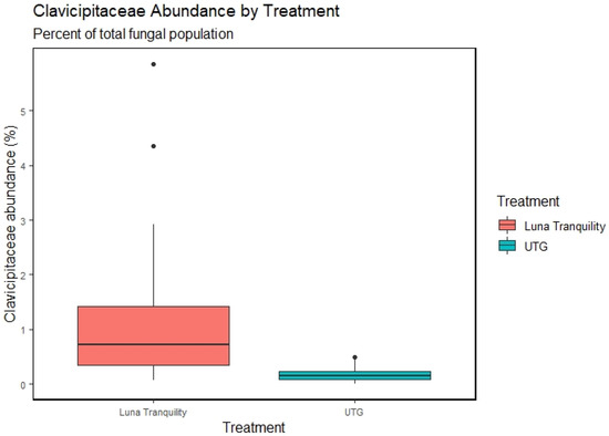 Clavicipitaceae abundances by treatment group. Abundances of Clavicipitaceae were significantly increased in plots treated with Luna Tranquility relative to UTG (Wilcoxon test, BH-corrected p value < 0.05).