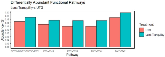 Significant differences in the relative abundances of functional pathways were found between Luna Tranquility and UTG, with 22 pathways having significantly different relative abundances between the two groups. The pathways with a mean abundance of greater than 0.1% are shown in Figure 4. The most abundant of these pathways was PWY-7242, through which D-fructuronate is degraded, and exhibited a higher relative abundance in the Luna Tranquility treatment group than in UTG. Additionally, BIOTIN-BIOSYNTHESIS-PWY—biotin biosynthesis I—through which the microbe creates biotin, was found to be of increased relative abundance in Luna Tranquility. Additionally, PWY-6519 (8-amino-7-oxononanoate biosynthesis I), PWY-6628 (superpathway of L-phenylalanine biosynthesis), and PWY-6630 (superpathway of L-tyrosine biosynthesis) all presented higher relative abundance in Luna Tranquility than in UTG. No other fungicide treatment provoked significant changes in relative abundances of functional pathways relative to UTG.
