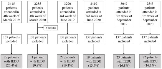 By means of a stratified analysis of each period, in March 2019, a prevalence of 20.4% of IEDU was found, compared to 0.9% in March 2020 (p < 0.001). No differences were found between June 2019 and 2020 (16.1% prevalence versus 13.9%; p = 0.611) and between September 2019 and 2020 (16.8% versus 16.1%; p = 0.870).