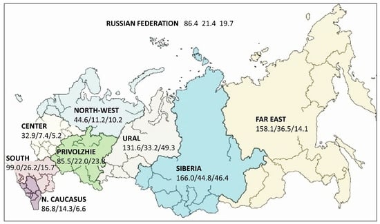 TB and MDR-TB are not evenly prevalent across the large territory of the Russian Federation (Figure 1). The Asian part of the country, namely Siberia and the Far East, is marked with the highest TB incidence, prevalence, and mortality aggravated by TB/HIV coinfection. In Siberia, the incidence of HIV infection was 65.5/100,000, and the incidence of HIV-TB coinfection was 18.8/100,000. The MDR-TB incidence in Siberia exceeded the average Russian level by 1.4–1.7 times [,].