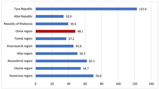 In general, 9379 cases of active TB were detected (55.0 cases per 100,000 population) in the Siberian Federal District in 2021. The TB incidence was 1.7 times higher than the national average, which amounted to 45,420 cases (31.1/100,000 population). The largest contribution to the incidence rate was by such provinces as Kemerovo—19.7% (n = 1852 cases), Novosibirsk—8.4% (n = 1729), and Irkutsk—13.9% (n = 1303) (Figure 2 and Figure 3). The Omsk region accounted for 9.8% of all cases in Siberia; the relative incidence rate was 48.1/100,000, which is 14% less than in Siberia. Since 2012, the TB incidence has decreased from 93.9/100,000 by 1.9 times. At the same time, the primary MDR-TB rate increased from 19.2% in 2012 to 26.4% in 2021 (Figure 4).