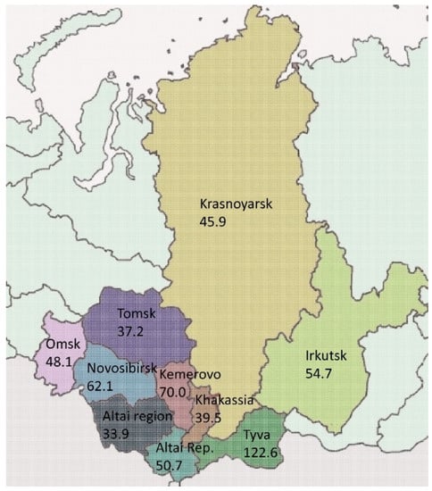 TB incidence in the regions of the Siberian Federal District of Russia. Free map: https://upload.wikimedia.org/wikipedia/commons/thumb/1/1c/Siberian_Federal_District_%28numbered%2C_2018_composition%29.svg/800px-Siberian_Federal_District_%28numbered%2C_2018_composition%29.svg.png (accessed on 15 January 2023).