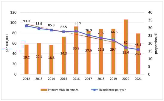 The World Health Organization has developed the End TB Strategy, which set the most ambitious goals of reducing the incidence of tuberculosis (TB) by 90% compared to 2015 and deaths due to TB by 95% by 2035, as well as eliminating the economic and social burden associated with this disease [,]. At the same time, the achievement of the goals set in the fight against TB is threatened by TB/HIV coinfection, the spread of drug-resistant Mycobacterium tuberculosis strains, and finally, the most recent COVID-19 pandemic, which places a significant burden on the global economy [,,]. In 2021, the WHO estimated that 10.6 million people (95% CI: 9.9–11 million) developed TB worldwide, which is equivalent to an incidence of 134 (95% CI: 125–143) per 100,000 population. In 2021, the global TB incidence increased by 4.5%, reversing a long-term trend of a moderate 2% annual decrease over the past decade [].