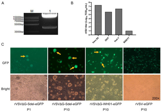 The VSV full-length plasmid was constructed in pcDNA3.1 vectors as described previously [17], named p3.1-VSV-eGFP. The glycoprotein protein gene of p3.1-VSV-eGFP was replaced by the SARS-CoV-2 Delta variant spike protein gene (OL336792.1), and the enhanced green fluorescence (eGFP) reporter gene was inserted between the N gene and the P gene to generate the recombinant full-length plasmid (designated as p3.1-VSVΔG-Sdel). The pcDNA3.1-VSV-N, pcDNA3.1-VSV-P, pcDNA3.1-VSV-L, and pcDNA3.1-VSV-G plasmids were generated as described previously [17], and stored at −80 °C. The p3.1-rVSVΔG-Sdel and four helper plasmids were cotransfected into BSR/T7 cells. The procedure was carried out in accordance with the calcium phosphate transfection kit instructions (Invitrogen, Waltham, MA, USA). The recovery of the viruses was determined by cytopathic effects and eGFP reporter expression. The first generation of the recombinant virus was passaged on Vero E6 cells (Figure 1).