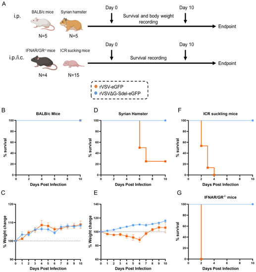 Body weight changes and survival curve of animals post rVSVΔG-Sdel-eGFP infection. (A) Safety evaluation procedure of animal. Animals were intraperitoneally or intracranially administrated with rVSVΔG-Sdel-eGFP on Day0. Survival rate and body weight changes of animals were monitored for 10 consecutive days post-infection. (B,C) The survival rate and weight change of BALB/c mice (n = 5). (D,E) The survival rate and weight change of Syrian hamsters (n = 5). (F) The survival rate of ICR suckling mice (n = 15). (G) The survival rate of IFNAR/GR−/− mice (n = 4). rVSV-eGFP infection served as the control group. Data represent the mean ± standard error of the mean (SEM). The dotted line indicates the percentage of initial weight.