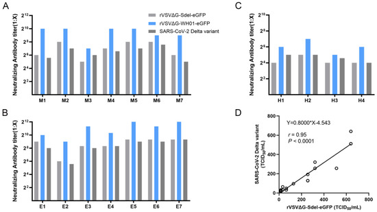 The application of recombinant viruses in serological assays. (A–C) Neutralizing antibody activities in mice (A), equine (B) and human (C) samples were determined using a surrogate virus neutralization assay. The rVSVΔG-WH01-eGFP and authentic virus (SARS-CoV-2 Delta variant) were used as a control virus. Each sample was repeated twice in parallel, and the mean is shown in the graph. M, mice; E, equine; H, human. (D) Correlation analysis of neutralization TCID50 values between rVSVΔG-Sdel-eGFP and the SARS-CoV-2 Delta variant.
