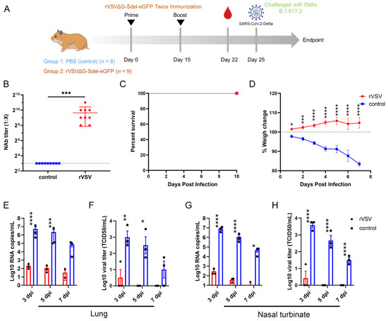 Immunogenicity evaluation of recombinant viruses in Syrian hamsters. (A) Immunization and challenge strategy. Syrian hamsters (nine animals per group) were intranasally immunized with recombinant viruses (2 × 106 TCID50/animal) or PBS (control). Animals were boosted at a 15-day interval. Blood samples were collected at 22 days post vaccination. On day 25, Syrian hamsters challenged 105 TCID50/animal SARS-CoV-2 Delta variants. (B) The titer of neutralizing antibodies against rVSVΔG-Sdel-eGFP in Syrian hamsters. (C) Survival rate of Syrian hamster. (D) Weight changes of Syrian hamsters. (E–H) Viral RNA copies (E,G) and viral titer (F,H) of lungs and turbinate samples. A statistical analysis was determined using a Student’s t-test or two-way ANOVA analysis. * p < 0.05, ** p < 0.01, *** p < 0.001, **** p < 0.0001.