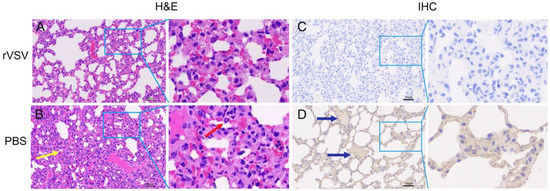 Lung pathology was reduced in rVSVΔG-Sdel-eGFP-vaccinated Syrian hamsters following challenge with the SARS-CoV-2 Delta variant. (A–D) The histopathology and immunohistochemistry (IHC) of Syrian hamster lungs are shown. (A) H&E stained sections of lung tissues obtained from rVSV-vaccinated mice shows no pathology after challenge. (B) The lungs of PBS-immunized mice showed marked pulmonary lesions, including severe parenchyma inflammation (the red arrow) and consolidation of pulmonary parenchyma (the yellow arrow) in H&E staining sections. (C,D) Numerous immunoreactivities (the blue arrow) are observed in the lung of the mock group, but no immunoreactivity was observed in the rVSV-vaccinated group. The scale bar = 50 μm.
