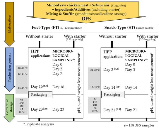 Manufacturing process and experimental design of fuet-type (FT) and snack-type (ST) dry-fermented sausages; n: total number of sampled sausages; d: days; DFS: Dry-Fermented Sausage; HPP: High-Pressure Processing; AF: After Fermentation; EP: End of Process; AS: After Storage.