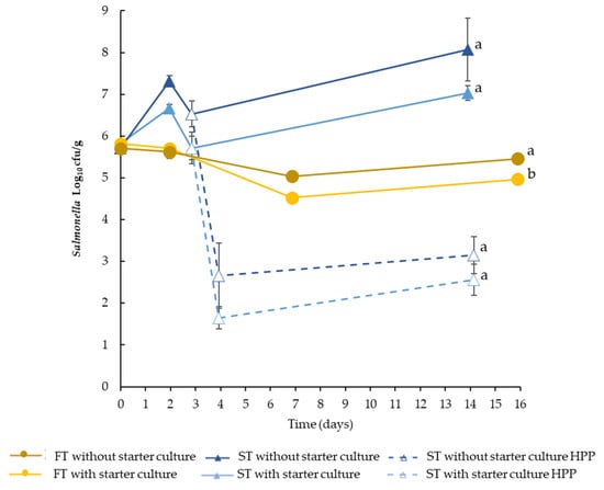 Counts (Log10 cfu/g) of Salmonella during the production process of fuet-type (FT) and snack-type (ST) without and with starter culture and/or HPP. Dashed lines represent HPP samples at day 3. Error bars: standard deviation of three replicates. For each type of product (without and with starter), values at the end of process with a different letter are significantly different (p < 0.05).
