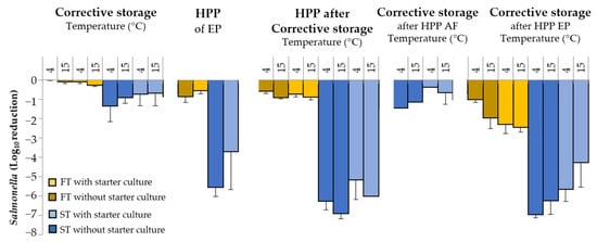 For ST sausage, HPP application just after the fermentation caused a reduction in Salmonella of ca. 4 Log10 and after the corrective storage produced an additional inactivation of slightly more than 1 Log10 in both DSF without and with starter (Figure 2). A lower inactivation (≤0.6 log10) was observed in ST with starter culture stored at 4 and 15 °C.
