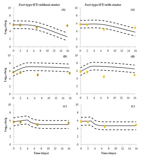 The model proposed by Pin et al. [] predicted a considerable growth during the first days of the production process in FT and particularly in ST sausages. In FT without and with starter culture, an increase of ca. 1 Log10 in 14 days was simulated. Subsequently, a slight inactivation was simulated for both batches (ca. 0.6 Log10 reduction in 14 days). Regarding ST, 3.7 and 4 Log10 increase were simulated for ST without and with starter culture, respectively, during the first day of fermentation, followed by a slight inactivation. The simulated behaviour resulted in greater Salmonella levels than the observed values during the challenge test (overestimation, fail-safe).