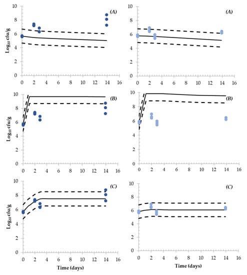 Simulation of Salmonella fate during the production process of snack-type DFS without (left) and with (right) starter culture. Simulations were performed in MS-Excel implementing the (A) Hwang et al. []; (B) Pin et al. [] and (C) Coroller et al. [] predictive models (continuous line). Dashed lines represent the acceptable simulation zone (ASZ) ± 1 Log10 interval and dots represent the observed Salmonella counts obtained in the challenge test.