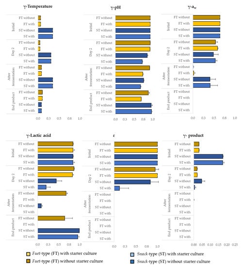 The contribution of each individual factor (pH, aw, temperature and lactic acid) and the interaction term (ε) resulting from the model proposed by Coroller et al. [] on the inhibition of Salmonella growth was quantified through the individual gamma (γ) estimates and the overall gamma product (Figure 6). The lower the γ value, the stronger the inhibitory effect (i.e., for γ = 0, growth is totally inhibited, while γ = 1 indicates no inhibitory effect at all). At the initial stage (day 0), temperature is the main limiting factor for Salmonella growth for FT and ST, both without and with starter culture. Regarding ST, the greater γ product obtained was due to the highly inhibitory effect of the γ temperature at day 0. While the γ pH was relatively high in all types of products (less contributing factor of the Salmonella growth inhibition), the accumulation of lactic acid after the fermentation had a clearly higher impact in sausages with starter culture. This biopreservation effect of the starter culture was the key inhibitory factor for ST sausages. The contribution of the lowered aw becomes relevant until the end product for all batches, making the ε fall to 0 (preventing growth).