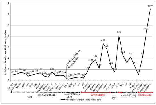 Our study revealed that the incidence density rate was three times higher when the hospital was a COVID-dedicated hospital, i.e., when only COVID-19-positive patients were hospitalized in it, than during the period when it was a non-COVID hospital, before and during the COVID-19 pandemic. The incidence of CDIs increased in the middle of the first decade of the 21st century due to new, highly virulent C. difficile strains such as ribotype (RT) 027 [18]. Improvement in the rational use of antibiotics, along with other infection prevention and control measures, as the essential factors in the prevention of CDI became the national priority in many countries and the subject of organized surveillance [17,19]. Then, it was observed that HA-CDIs decreased by 36% in the USA during 2011–2017 [3] due to efforts in implementing preventive measures, especially antibiotic stewardship, which reduced fluoroquinolone use in their hospitals [20,21]. Similar trends were observed in EU countries [4]. In the pre-pandemic period, the incidence rate obtained in our study was similar to those in some EU countries, Italy for example, but higher than in other EU countries with high HA-CDI incidence rates [4,22].