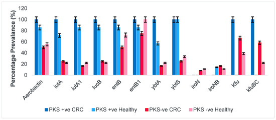The key observable difference between the PKS-positive and PKS-negative K. pneumoniae isolates is the abundance of virulence genes present within the PKS-positive K. pneumoniae genome. PKS-positive isolates had a greater abundance of genes responsible for siderophore production, namely aerobactin, enterobactin, and yersiniabactin, compared to PKS-negative isolates that were more associated with only enterobactin siderophore. The ability to produce more than one group of siderophore increases the organism’s ability to sequester iron more efficiently from the host environment, thus enhancing its survival within the host. A similar observation was made by Khaertynov et al. [28], where aerobactin siderophore was more associated with the presence of the colibactin gene in rmpA-positive isolates.