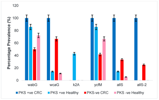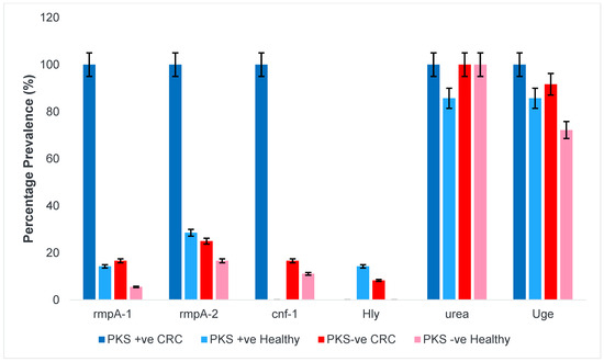 Additionally, the genes coding for allantoin metabolism (allS, allS2) was more expressed in PKS-positive strains. Allantoin metabolism is a vital process that allows an organism to utilize allantoin as a source of carbon and nitrogen. Chou et al. [31] showed that K. pneumoniae was able to utilize not only carbon but nitrogen as a source of energy under both aerobic and anaerobic conditions. This shows the ability of PKS-positive isolates to sustain and persist under stressful conditions and environments such as the tumour microenvironment within a CRC patient. The results of the virulence gene detection are listed in Supplementary S2.