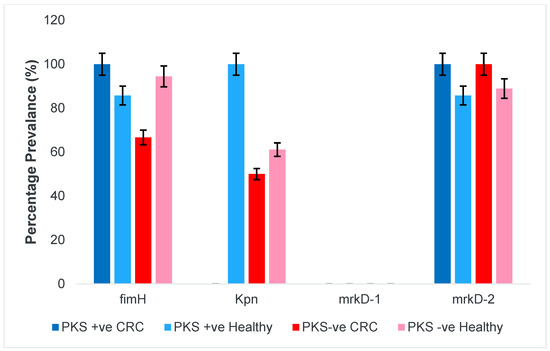 Fimbriae and adhesins are vital for the attachment and colonization on the colonic mucosa. The kpn gene which is responsible for type 1 fimbriae-like adhesin is lacking among PKS-positive isolates from CRC patients. However, it is found in 100%, 50%, and 61% of PKS-positive (healthy), PKS-negative (CRC), and PKS-negative (healthy) isolates respectively. None of the isolates possessed the mrkD-1 gene which is a type 3 fimbriae but was compensated by the presence of other adhesins and fimbriae. Figure 3 shows the prevalence of genes responsible for presence of fimbriae and adhesins.