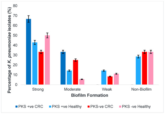 3.3. Presence of PKS Gene Improves Biofilm-Forming Capabilities of K. pneumoniae Isolates