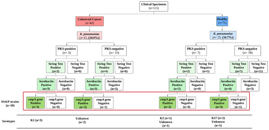 K. pneumoniae presence of PKS colibactin gene and capsular serotype.