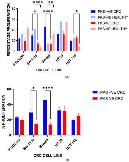 However, PKS-positive isolates isolated from CRC patients had the highest enhancement of cell proliferation across all cell lines except for SW1116 (stage I), where the PKS-positive isolate from healthy patients had a slight edge. The highest enhancement of cell proliferation was observed in the SW480 (stage II) cell line. The enhancement of cell proliferation trend showed a bell-shaped curve that progressed from the human primary cell line and peaked at SW480 (stage II) after which the enhancement of cell proliferation decreased. Additionally, PKS-positive isolates showed better enhancement of cell proliferation compared to PKS-negative isolates, irrespective of isolate origin. There is some plausibility that the presence of the PKS colibactin gene along with co-virulence factors could play a role in enhancing the progression rate of CRC, especially in the normal and early stages of CRC (as observed in the primary and CRC cell line of stage I and II).
