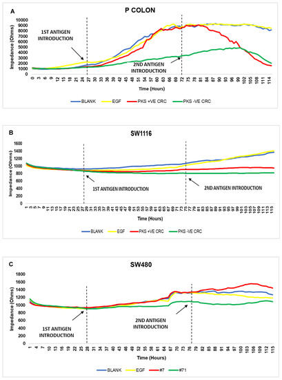 The ECIS array measures the increase in electrical impedance that directly corresponds to the increase in cell proliferation. The ECIS array contains gold electrodes at the bottom of the wells that are able to detect the growth of cells. As the cells proliferate and cover the electrode, the impedance increases until confluency is achieved. Briefly, CRC cells were seeded at a density of 50,000 cells per well in 400 µL of medium in 8 well plates with 10 gold electrodes (8W10E PET, Ibidi, Gräfelfing, Germany). The impedance was measured using the ECIS model Zθ (Z Theta) (Applied Biophysics, US, Troy, MI, USA). The cells were incubated for a period of 6 days at 37 °C with 5% CO2 with medium renewal at day 3 as well as antigen introduction at days 1 and 3.