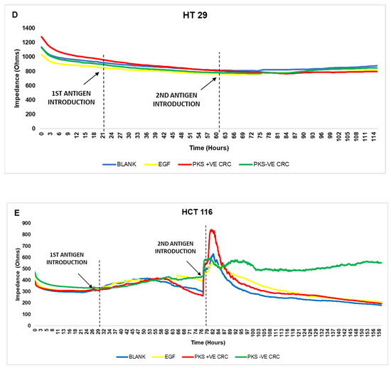 Impedance of CRC cell lines upon recurrent exposure to K. pneumoniae antigens. (A): healthy, (B): stage I, (C): stage II, (D): stage III, (E): stage IV.
