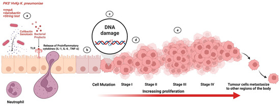 Klebsiella pneumoniae (K. pneumoniae) is a Gram-negative bacterium of the Enterobacteriaceae family that colonizes human mucosal surfaces such as the nasopharynx and the gastrointestinal tract (GIT) [1,2]. K. pneumoniae has been an aetiological agent in a number of diseases such as hospital acquired infections, bacteraemia, endocarditis, pneumonia, as well as pyogenic liver abscess (PLA) [3,4]. In recent years, the incidence rate of K. pneumoniae infections worldwide has risen dramatically due to the emergence of multi-drug resistant (MDR) as well as extremely drug resistant (XDR) strains [5]. The lack of new antibiotics in the pipeline has also dampened efforts to curb and contain the infection. In addition to that, the development and dissemination of hypervirulent K. pneumoniae strains (hvKp) among Asian countries have also caused a peak in PLA cases being reported, especially in Taiwan and China, where K. pneumoniae has exceeded Escherichia coli (E. coli) as the most common pathogen isolated from PLA patients [6]. Increasing reports indicate the rise of hvKp strains being isolated from PLA patients with the majority of these strains belonging to the K1 and K2 serotype that are known to confer greater virulence. The hvKp differs from the classical K. pneumoniae (cKp) due to its increased virulence and ability to cause more severe infections compared to the latter. The hvKp strains are notorious for their biofilm forming properties as well as efficient iron uptake systems and siderophore production. These are some of the virulence factors that enhance the survival of K. pneumoniae within the host through evasion of host immune defences and its ability to sequester iron, allowing it to persist within the host. Furthermore, K. pneumoniae is known to harbour the polyketide synthase (PKS) island within its genome that produces colibactin genotoxin. This phenomenon has also been observed in E. coli, where reports demonstrated colibactin genotoxin’s ability to cleave host DNA double strands bringing about cell cycle arrest as well as DNA damage and mutations which initiates tumorigenesis [7]. This is pertinent, as an 11-year retrospective study conducted on PLA patients revealed that K. pneumoniae PLA patients had approximately three times higher risk of developing colorectal cancer (CRC) years after a PLA infection compared to non-K. pneumoniae PLA patients [8,9,10,11,12]. The common notion indicates PLA as a precursor disease and a risk factor of CRC development which is the second most common cancer diagnosed worldwide irrespective of gender. However, a case study by Li et al., of a 65-year-old man with no known chronic illnesses and surgical history, was suffering from hepatic portal venous gas (HPVG) demonstrated radiologically as pockets of gas that are formed as a by-product of K. pneumoniae metabolism that enter the portal venous system. [13]. The blood culture test conducted further validated the presence of K. pneumoniae and antibiotic treatment was implemented. Furthermore, upon treating the patient with empiric antibiotic therapy (sulbenicillin 8 g/day and metronidazole 2 g/day), there was a reduction in gas accumulation due to the inhibited reproduction of K. pneumoniae. The same patient was then diagnosed with colon cancer (TNM staging: T4bN2bM0) after a few days.