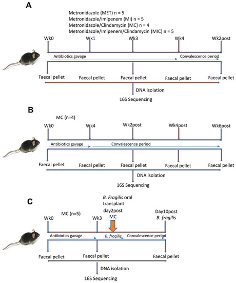 We initially treated four different groups of mice (4–5 per group) separately with either metronidazole (5 mg/mL) or a combination of metronidazole (5 mg/mL) + clindamycin (10 mg/mL), metronidazole (5 mg/mL) + imipenem (5 mg/mL), or metronidazole (5 mg/mL) + imipenem (5 mg/mL) + clindamycin (10 mg/mL) (Sigma Aldrich, USA) (Figure 1A). All mice received a daily dose of 200 µL of antibiotic preparations via the oral gavage for four weeks. The metronidazole (5 mg/mL) + clindamycin (10 mg/mL) treatment was repeated in two additional independent experiments using different sets of mice (Figure 1B,C). Fresh antibiotics were prepared at every 3-day interval.