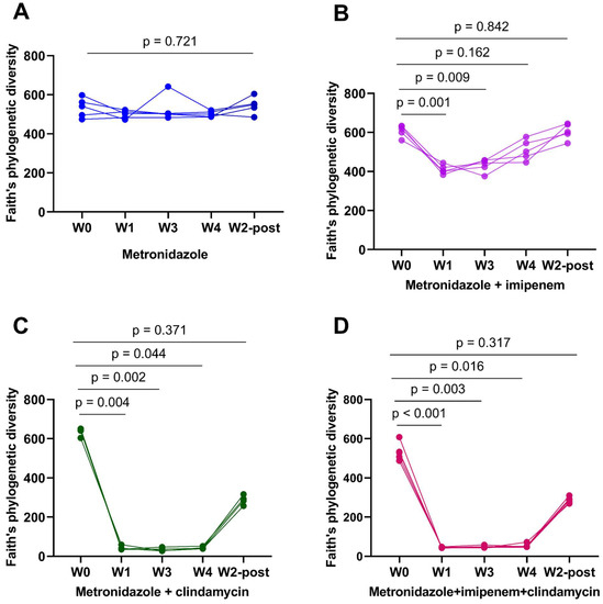 The addition of clindamycin rapidly reduces gut microbial diversity (A–D) alpha-diversity measured using Faiths’ phylogenetic index in metronidazole, metronidazole + imipenem, metronidazole + clindamycin, and metronidazole + imipenem + clindamycin-treated mice, respectively. p values for comparison between the baseline and the different time points are shown.