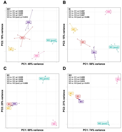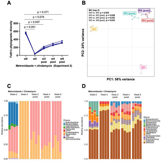 The α-diversity did not change during metronidazole (MET) treatment (Figure 2A). In metronidazole/imipenem (MI)-treated mice, a reduction in α-diversity was observed at weeks 1 and 3, relative to the baseline (week 0) (Figure 2B). The most significant reduction in α-diversity was seen when clindamycin was added to the antibiotic combination (Figure 2C,D). β-diversity differed between baseline and subsequent time-points in each antibiotic combination (Figure 3A–D).
