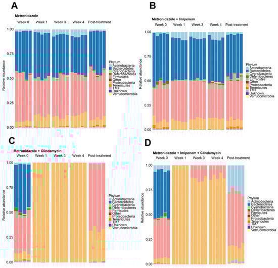 Stacked relative abundance plots at phyla level for mice treated with (A) metronidazole, (B) metronidazole + imipenem, (C) metronidazole + clindamycin, and (D) metronidazole + imipenem + clindamycin.