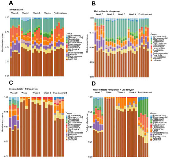 Stacked relative abundance plots at genus level for mice treated with (A) metronidazole (B) metronidazole + imipenem (C) metronidazole + clindamycin (D) metronidazole + imipenem + clindamycin.
